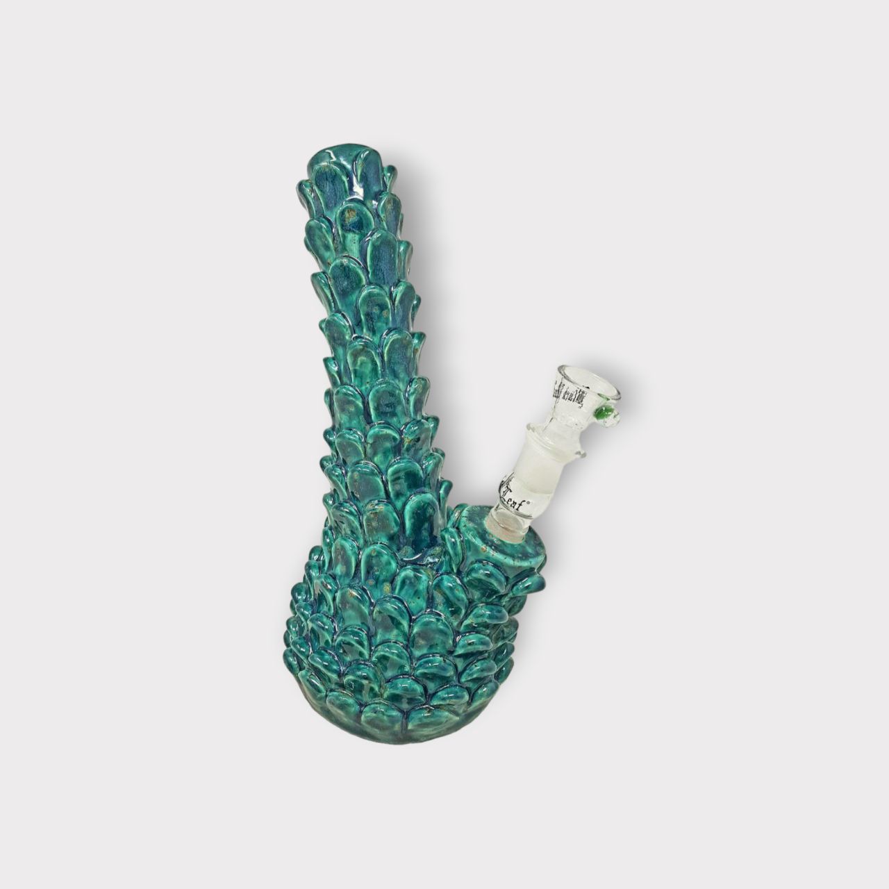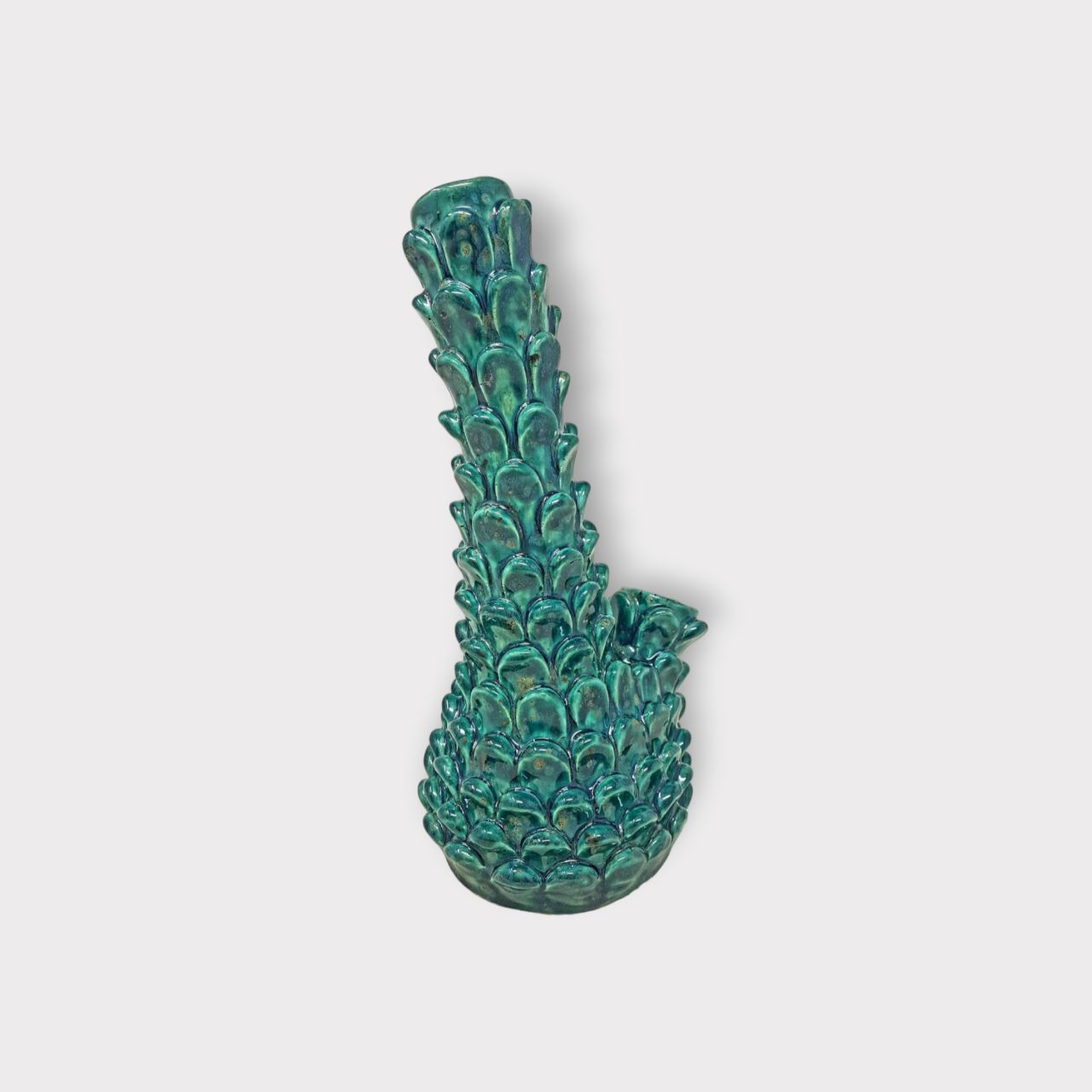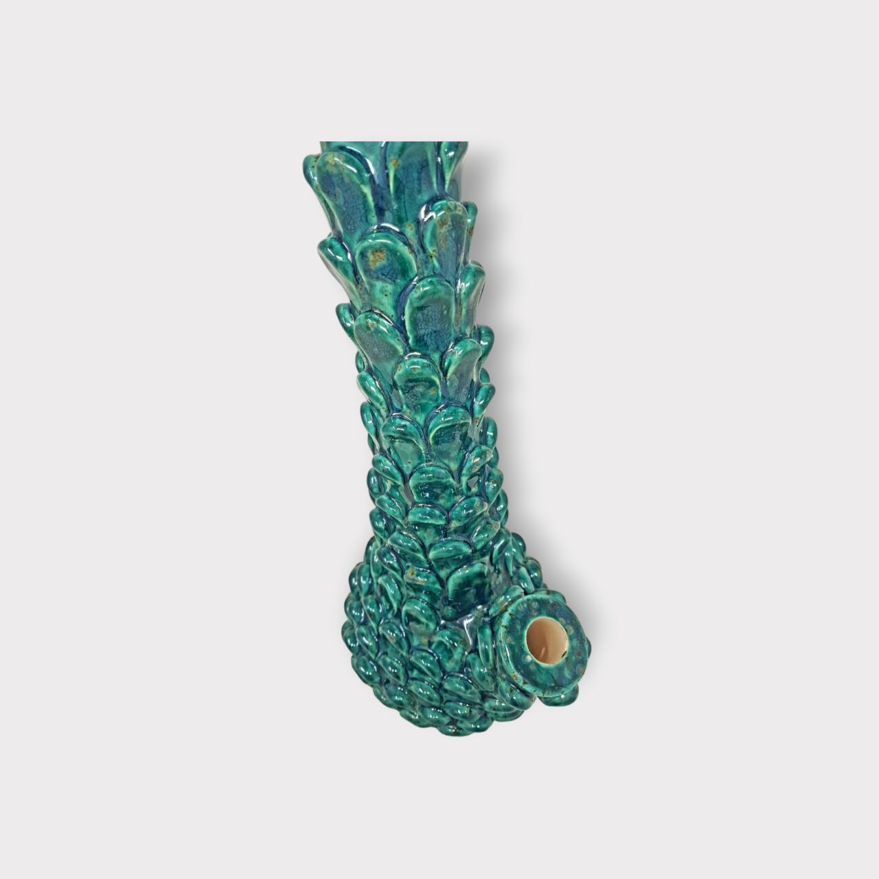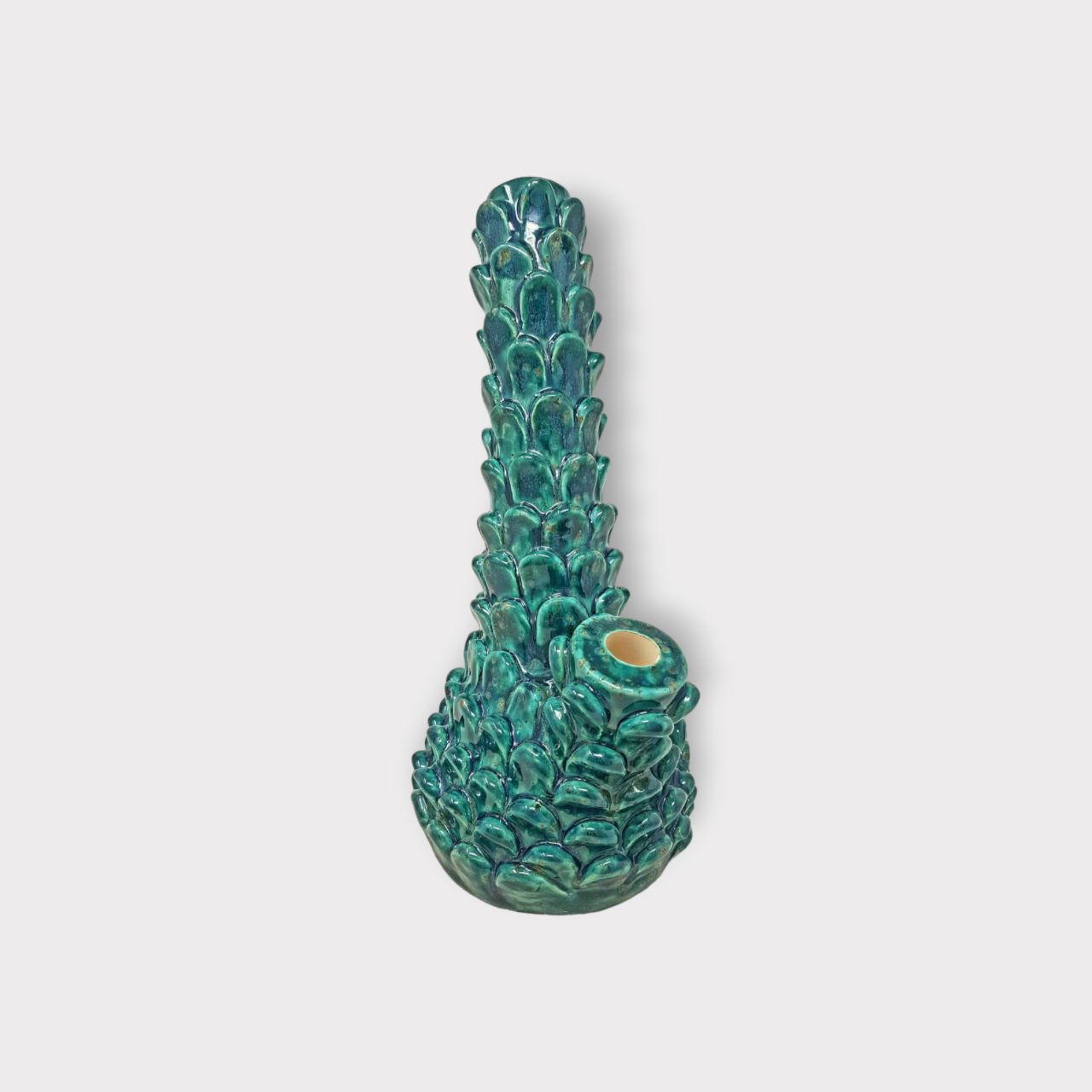 Nuestra pipa de agua de arcilla hecha a mano, con una ingeniosa forma de piña, no es solo una obra maestra estética, sino también un homenaje a la belleza natural. Este bong ha sido cuidadosamente elaborado a mano y acabado con un maravilloso esmalte verde, lo que lo convierte en un atractivo en cualquier habitación.