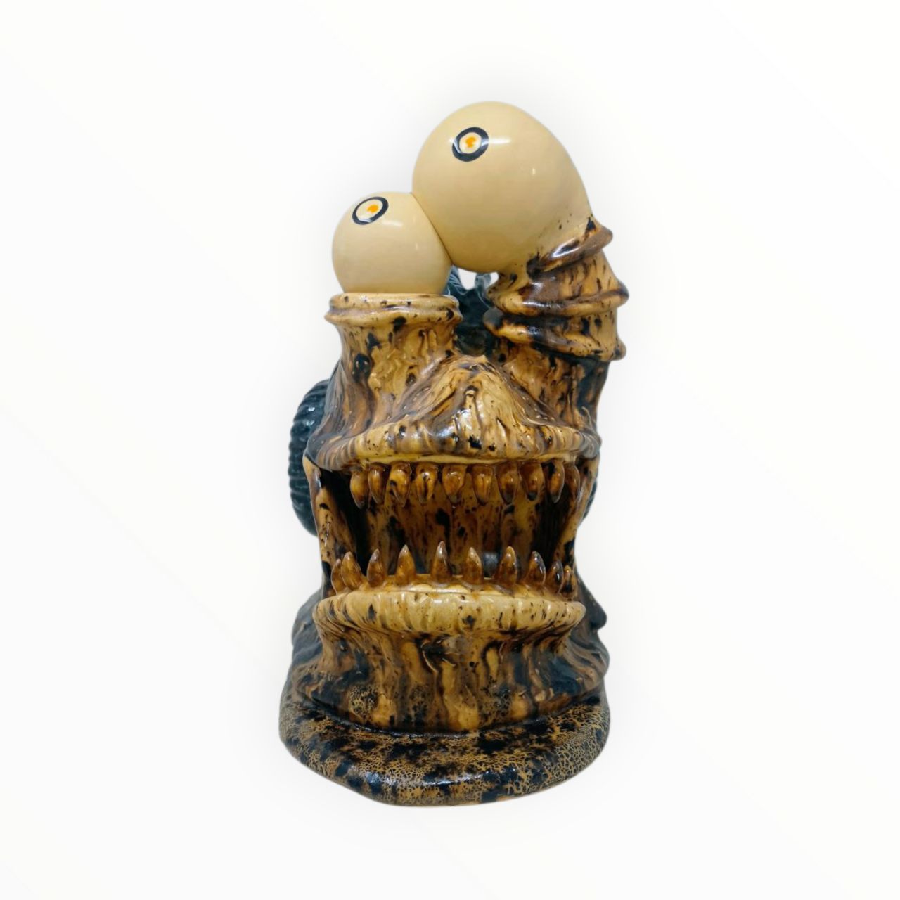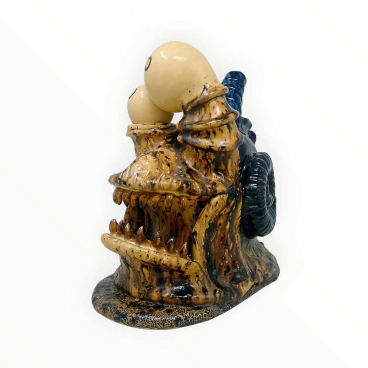 Diese Art Edition, Freddy Weedlee, kommt wie ein Wesen aus einer anderen Dimension: raue, organische Formen, zwei neugierige Kugelaugen und ein Maul voller wilder Zähne. Die glasierte Oberfläche wirkt wie versteinertes Holz, durchzogen von dunklen Adern und blauen Akzenten. Ein Stück, das nicht lieb sein will – sondern auffallen.